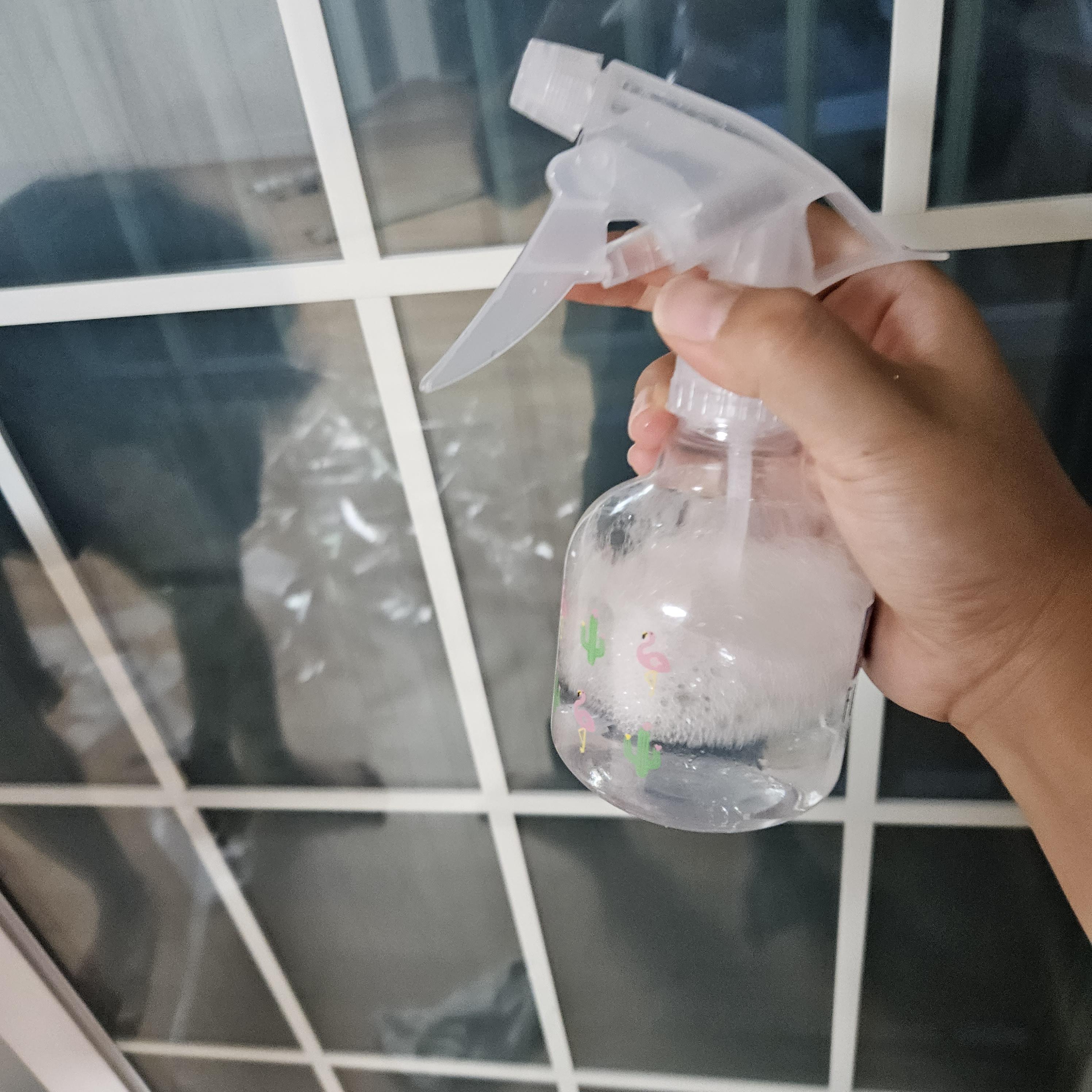 4. 유리창 위에 퐁퐁섞인물을 골고루 흠뻑 뿌려줍니다.