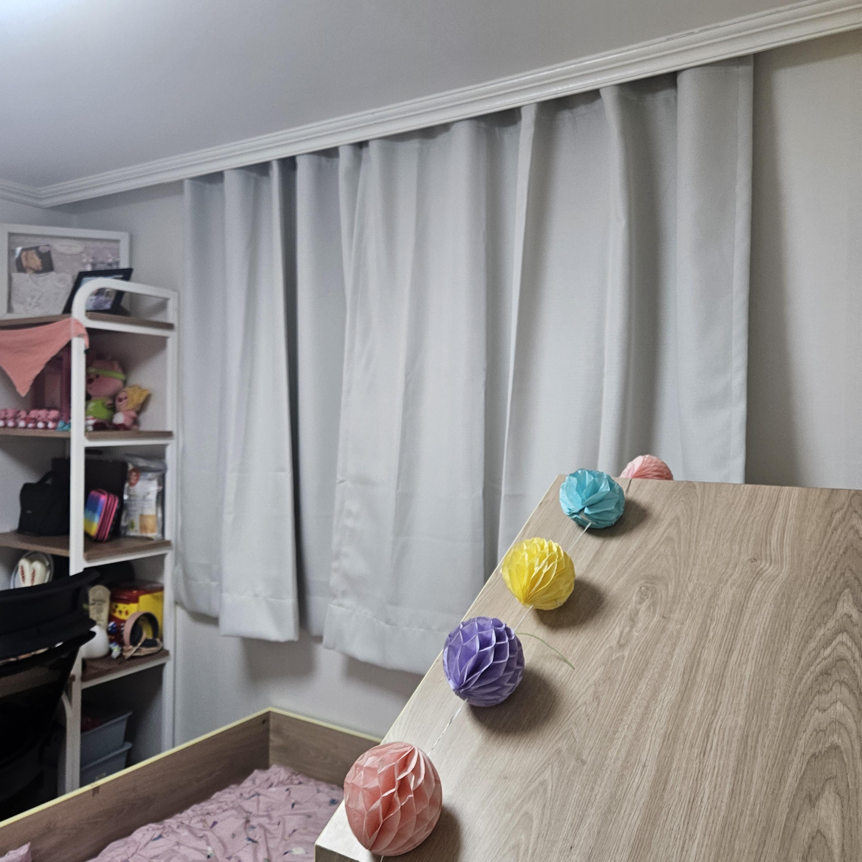 아이들이 깜짝깜짝 놀라서 암막 되는 커튼을 했어요