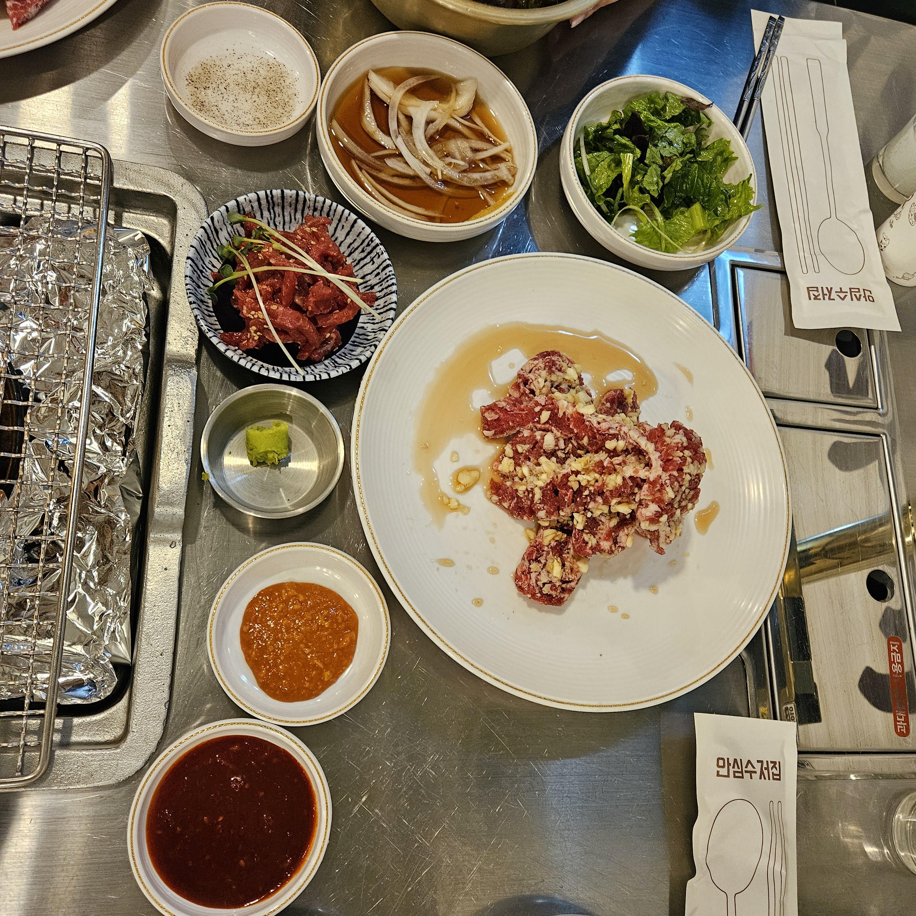 양파절임, 육회도 맛보기용으로 나오네요~~