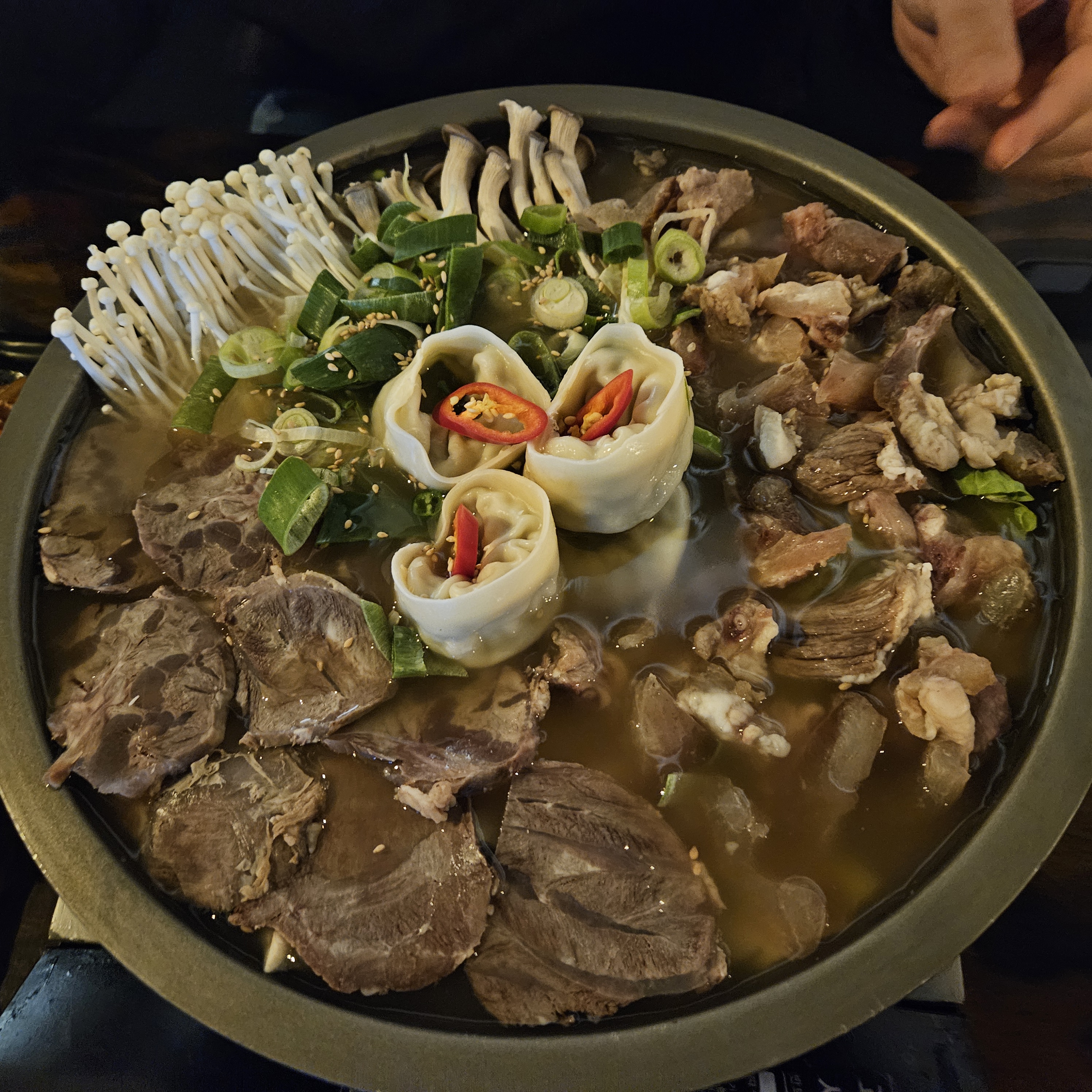 스지탕에는 만두 3개 스지, 고기, 버섯, 파, 배추가 들어있어요