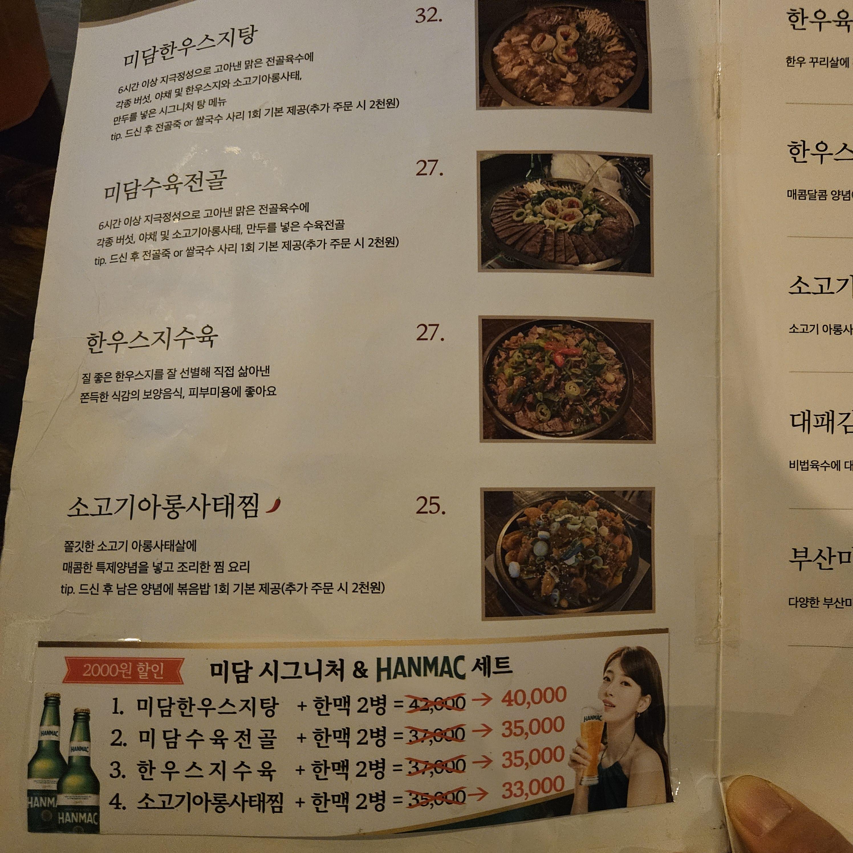 미담에서 인기메뉴 미담한우스지탕, 한우육회 라고 하네요~