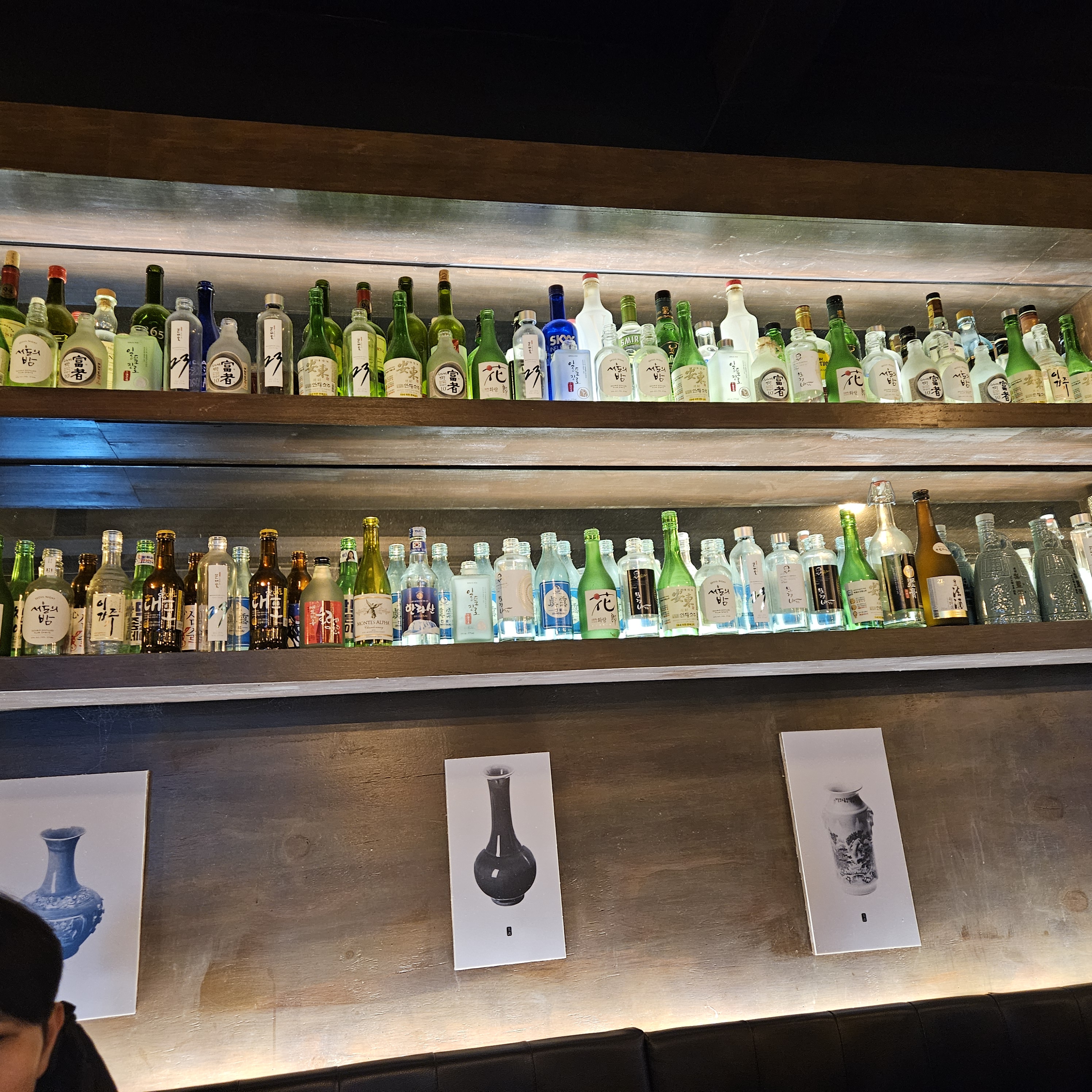 가게에 다양한 술병으로 인테리어 한 게 눈에 뜨였어요
